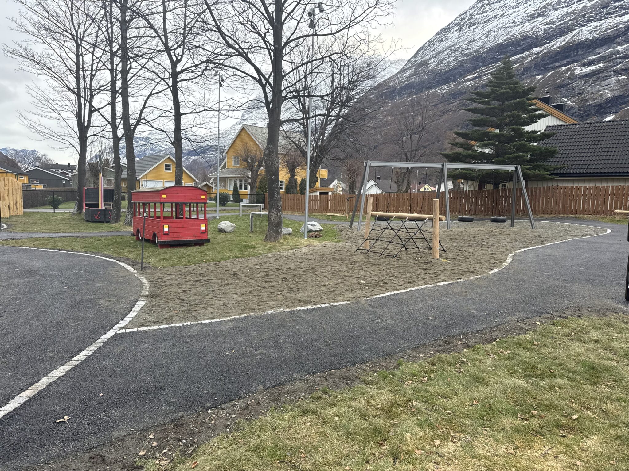 På grunn av høydeforskjellen på tomta, har uteområdet to nivå. Det har blant annet gjort det med en egen akebakke! I tillegg har ungene klatrestativ, fotballbane, fuglekasser, flaggermuskasser(!), balansebommer, sklier og en stolpeskog hvor de kan gå eller hoppe fra stolpe til stolpe.